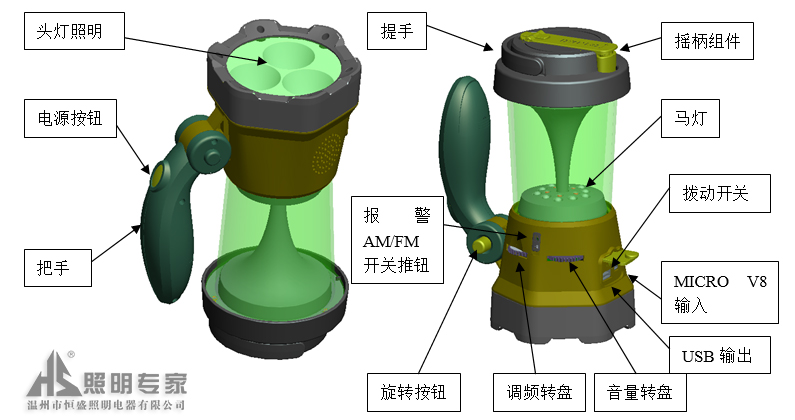救災(zāi)多功能應(yīng)急燈通過手搖發(fā)電原理,用手搖動(dòng)搖柄,經(jīng)內(nèi)部傳動(dòng)機(jī)構(gòu)變速后,帶動(dòng)應(yīng)急燈內(nèi)置電機(jī)發(fā)出交流電,再經(jīng)整流穩(wěn)壓后轉(zhuǎn)換為直流電,對內(nèi)置電池充電,達(dá)到能量轉(zhuǎn)換并儲能的目的;采用集成電路芯片,由三檔撥動(dòng)開關(guān)切換報(bào)警功能和頻段:FM-AM(調(diào)頻-調(diào)幅),頻率及音量手動(dòng)旋鈕調(diào)諧,收音為手動(dòng)搜索選臺方式:選擇你喜歡頻道率收聽;救災(zāi)多功能應(yīng)急燈還具有照明、手搖對電池及數(shù)碼類產(chǎn)品充電功能。