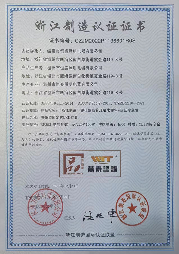 2022年12月 ,溫州市恒盛照明電器有限公司順利通過了產(chǎn)品檢驗(yàn)與“浙江制造”  評價(jià)規(guī)范管理要求評審 ,獲得《浙江制造認(rèn)證證書》  !我司將會(huì)繼續(xù)不斷創(chuàng)新 ,開拓進(jìn)取 ,努力將更優(yōu)質(zhì)的產(chǎn)品輸送給市場 ,感謝新老客戶一直的信賴與支持。