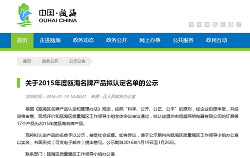 甌海區(qū)人民政府網(wǎng)站最近發(fā)布公告稱:根據(jù)《甌海區(qū)名牌產(chǎn)品認(rèn)定和管理辦法》規(guī)定,按照“科學(xué)、公開、公正、公平”的原則,經(jīng)企業(yè)自愿申報,并經(jīng)資格審查、現(xiàn)場評價和甌海區(qū)質(zhì)量強(qiáng)區(qū)工作領(lǐng)導(dǎo)小組全體會議審議通過,擬認(rèn)定溫州市恒盛照明電器有限公司的燈具等17個產(chǎn)品為2015年度甌海名牌產(chǎn)品。此次同步進(jìn)入的同行還有浙江正輝照明工程有限公司及浙江森馬企業(yè)等知名企業(yè)。