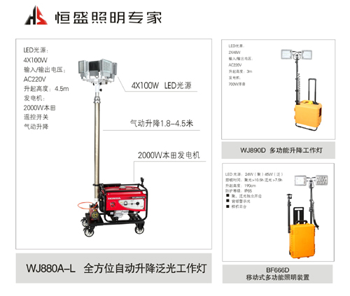 1、從上面上市產(chǎn)品列表不難發(fā)現(xiàn),2016新產(chǎn)品的特點(diǎn)除了LED外還是LED。比如LED款全方位自動(dòng)升降泛光工作燈(WJ880A-L),LED車載遙控探照燈(WJ828D)這兩款產(chǎn)品傳統(tǒng)光源都是選用氙氣,鹵鎢燈,金鹵燈,鈉燈等光源。恒盛照明企業(yè)在LED應(yīng)用到爐火純青階段全部更新為L(zhǎng)ED光源。經(jīng)過(guò)現(xiàn)場(chǎng)測(cè)試,同等條件下LED光源完勝鹵鎢燈光源。