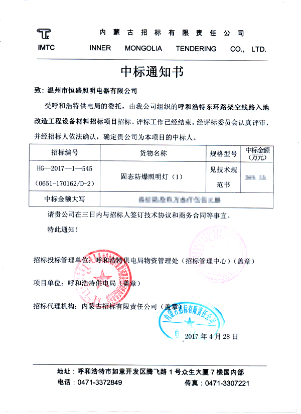 此次內蒙古呼和浩特電業(yè)局在改造工程中用到一批固態(tài)防爆照明燈,進行了公開招標,恒盛照明企業(yè)披荊斬棘突破重圍,拿到這個標段的中標通知書。
